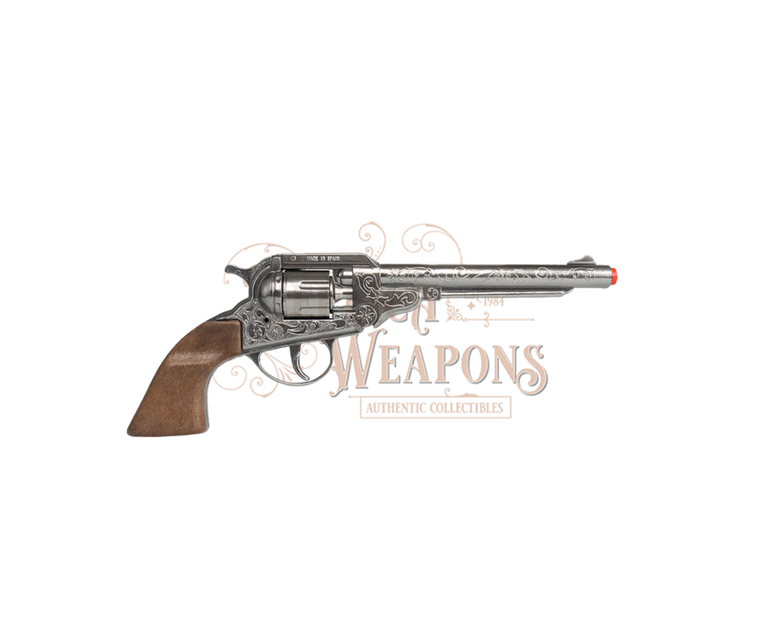 Cowboy metal revolver in cardboard box. Uses 8-shot caps. Made in Spain.