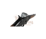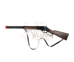 Double-action metal cowboy rifle in cardboard box. Uses 8-shot caps. Made in Spain.