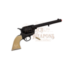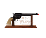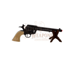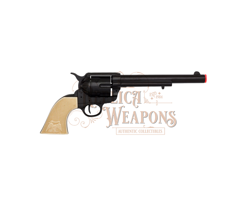 Revolver reproduction 7½" made of metal with plastic grips in ivory imitation, with simulated mechanism of charge and firing and rotating drum.