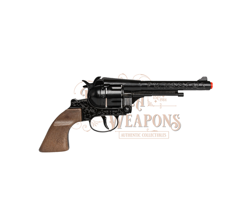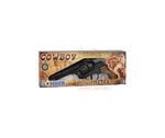 Cowboy metal revolver in cardboard box. Uses 12-shot caps. Made in Spain.